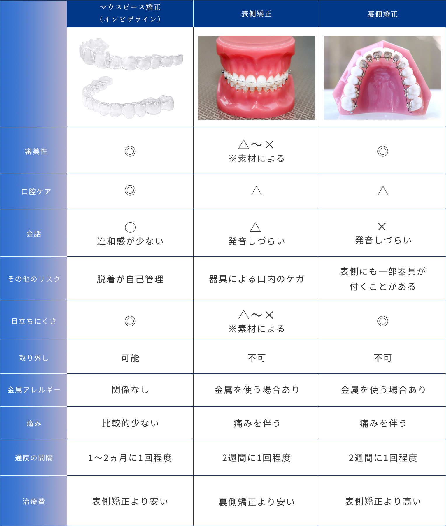 マウスピース矯正(インビザライン)は軽症例から難症例まで幅広く治療できる矯正装置です。しかし、歯並びの状態によってはマウスピース矯正(インビザライン)以外の治療をご提案させていただく場合もございます。症状改善を目指し、患者様に合わせた治療をご提案いたしますので、まずはお気軽に無料相談にお越しください。